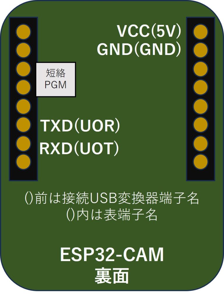 ESP32-CAMはUSBシリアル接続機能が実装されていないので、USB-シリアル変換器と裏面ピン端子と接続する必要があり、右図のピン接続情報を基に接続する(TxD/RxDをクロス接続)。