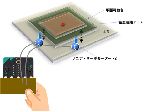 micro:bitの加速度センサーを使用して、小型の玉を使用した「箱型迷路ゲーム」を制御する置台となる平面台ロボットをmicro:bitの加速度センサーで操作する。そのシステムイメージを下記に示す。