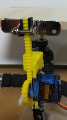 - 右の写真の様に、平面台が土台と並行な位置で、サーボモータの90°位置でリニア歯と「回転プレート」のネジで固定