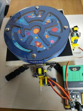 箱を傾けて中の玉を誘導する迷路ゲームを平面台ロボットに載せて mincro:bit で操作。